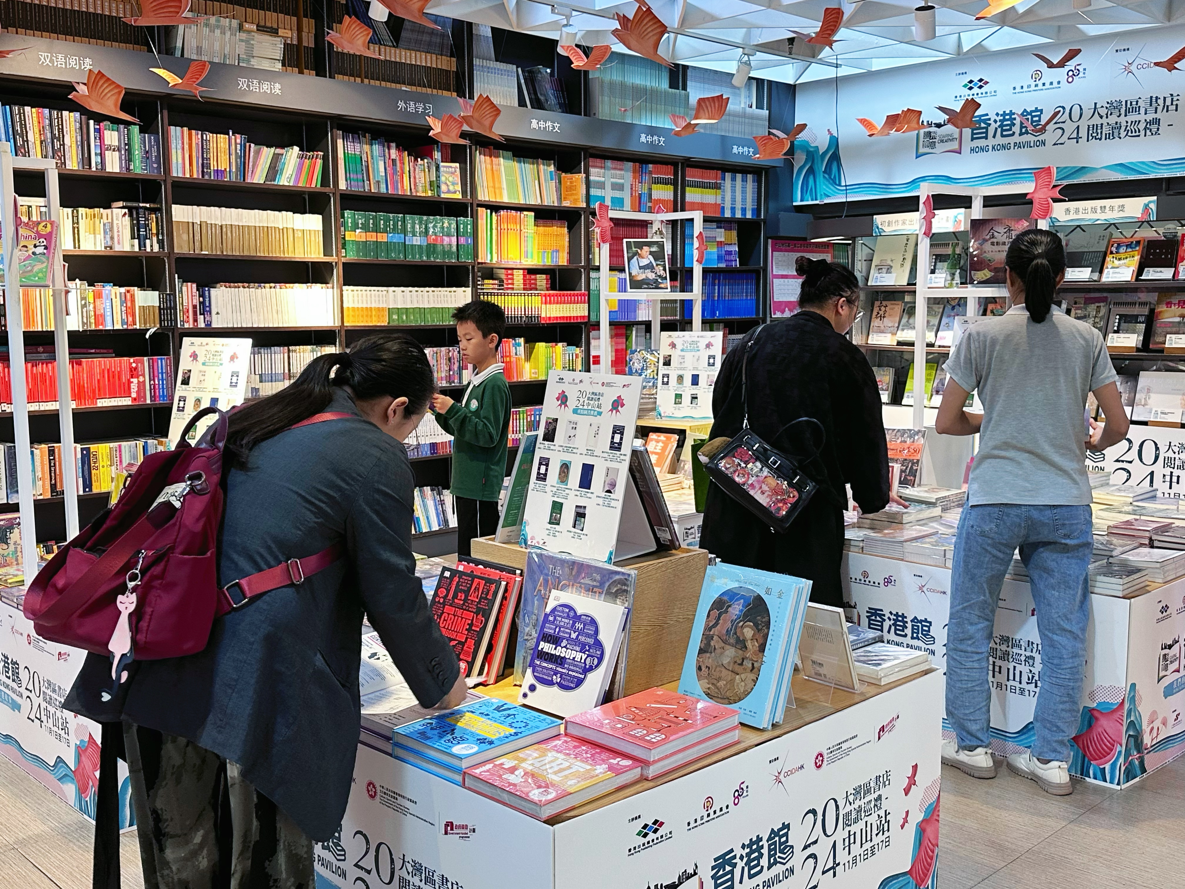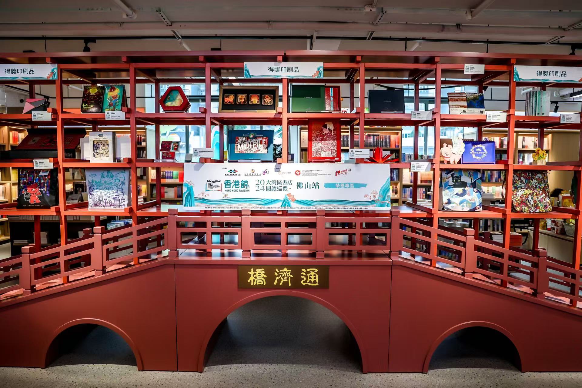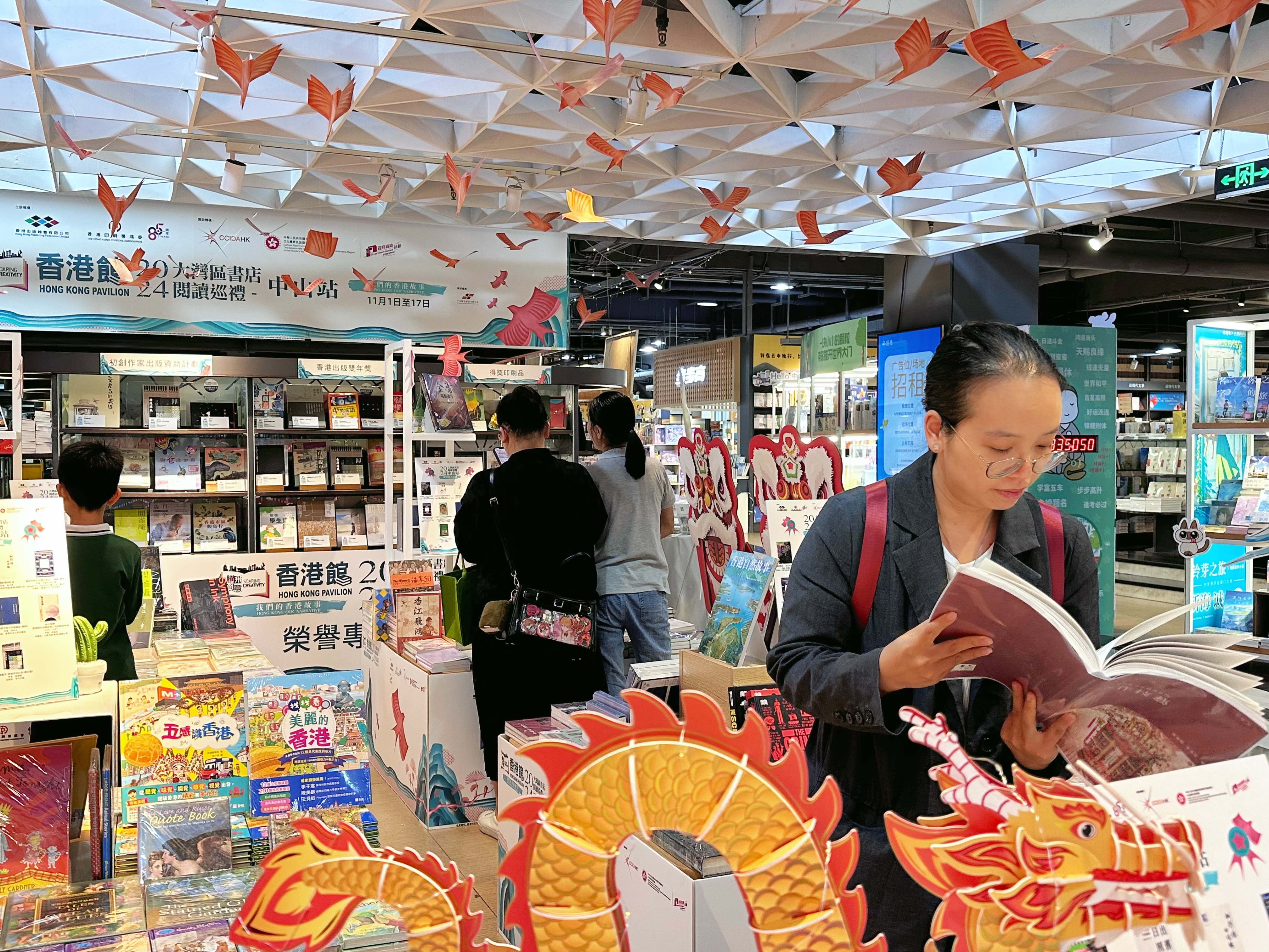 - 為推廣香港出版及印刷業,並協助業界開拓境外商機,由香港出版總會及香港印刷業商會合辦,文創產業發展處資助的「騰飛創意-香港館」項目(下稱「騰飛創意」項目),繼今年3、6、8、10月於意大利「博洛尼亞兒童書展」、「北京國際圖書博覽會」、廣州「南國書香節」及德國「法蘭克福書展」設立線上線下「香港館」後,再接再厲首辦「大灣區書店閱讀巡禮」,於今年10月至明年1月巡迴澳門、中山、佛山及東莞四地的書店展銷香港暢銷書籍,旨在促進粵港澳大灣區同城文化共融,弘揚優秀特色灣區文化。繼10月5日至22日澳門站後,巡禮的內地首站定於今天(11月1日)至11月17日假中山博雅書店舉行。 「大灣區書店閱讀巡禮」之中山站結合中山在大灣區中的樞紐支點角色與「書香中山」建設,展銷約600本香港精選圖書,其中包括由文創產業發展處資助的第一及二屆「想創你未來 - 初創作家出版資助計劃」及第三及四屆「香港出版雙年獎」的獲獎書籍。同時為配合巡禮「弘揚中華文化」的主題,場內特別展出創新紙製立體獅頭及立體發光祥龍,以及兩張美觀與實用兼備的獅頭紙椅,彰顯傳統中國紙藝結合現代印藝的成果。同場亦展出多款得獎印刷品,以加深參觀者對香港出版及印刷創意的認識。