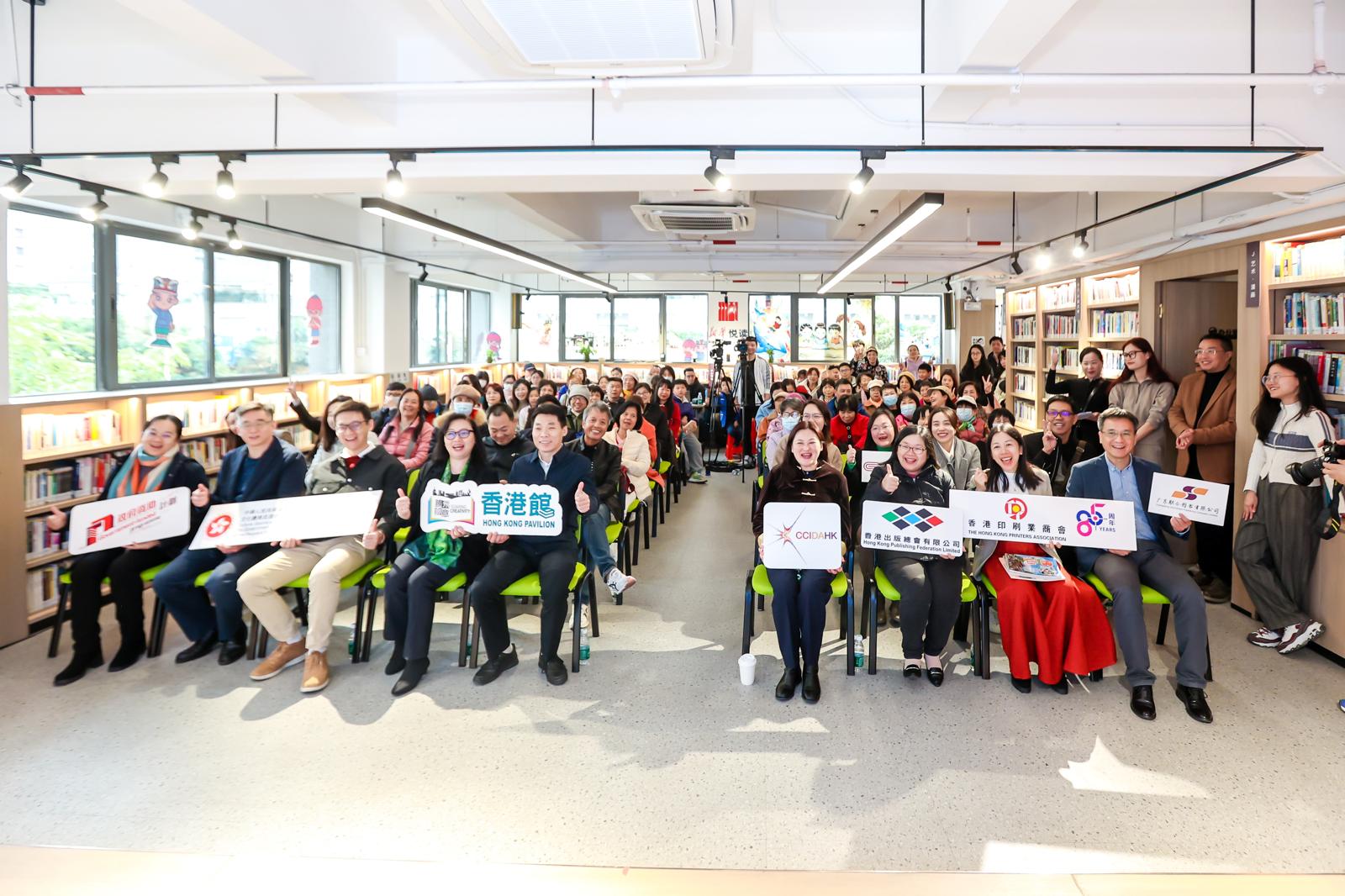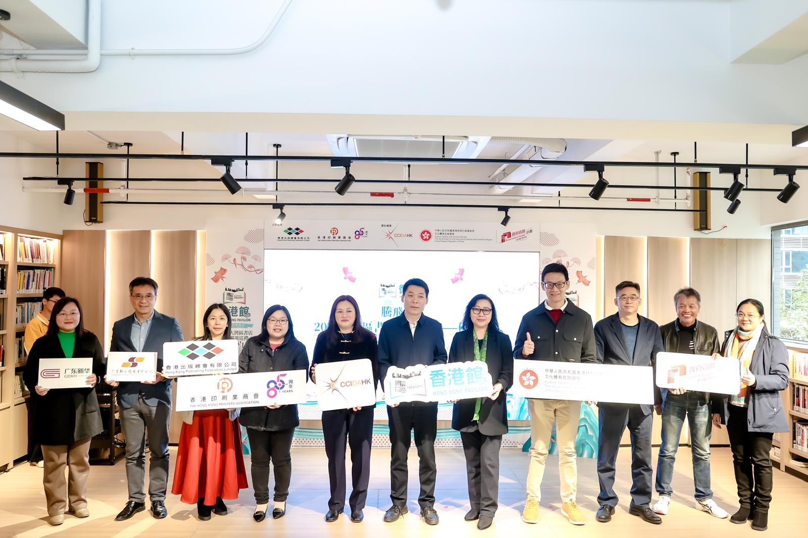 - 為推廣本港優質與創新的文創產業,由香港出版總會及香港印刷業商會合辦,文創產業發展處資助的「騰飛創意-線上線下香港館」項目(下稱「騰飛創意」項目),今年首辦「大灣區書店閱讀巡禮」(下稱「巡禮」),早前順利完成澳門站和中山站後,12月15日到明年1月5日在佛山古鎮新華悅讀空間舉行佛山站,展銷約1800本香港精選圖書,是跨年至2025年的印刷與出版業界粵港澳大灣區的文化交流盛事。為隆重其事,香港出版總會及香港印刷業商會,於12月15日下午三時為佛山站舉行開幕儀式,恭請佛山市委宣傳部副部長汪精華先生、香港特別行政區政府文創產業發展處總監(建築、印刷出版及推廣)戚芷筠女士、「騰飛創意-香港館」項目籌委會主席陳儉雯女士、2024南國書香節「香港館」暨大灣區書店閱讀巡禮主席葉佩珠女士、佛山市禪城區委宣傳部常務副部長、區文化廣電旅游體育局局長楊濤先生、中華商務贸易有限公司董事長王凱先生、佛山市委宣傳部出版版權科科長勞燕貞女士、佛山市禪城區委宣傳部副部長及區新聞出版(版權局)局長彭迪麗女士,聚首一堂主持剪綵儀式,正式為展期為期22天的巡禮佛山站揭開序幕。