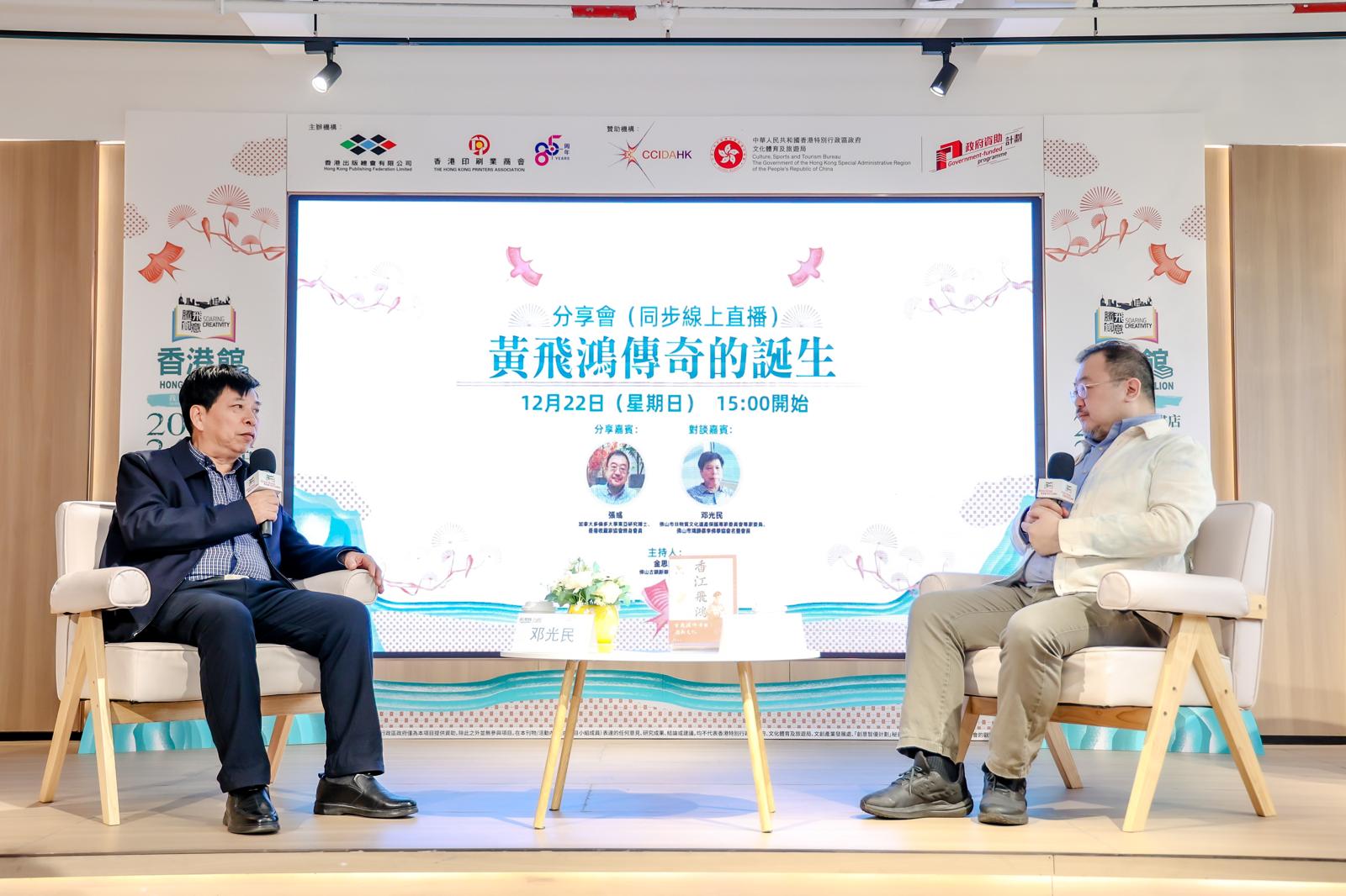 - 由香港出版總會及香港印刷業商會合辦,文創產業發展處資助的「騰飛創意-香港館」項目,舉行「大灣區書店閱讀巡禮」之佛山站,12月22日帶來一場精彩的分享活動,由加拿大多倫多大學東亞研究博士、香港收藏家協會終身會員張彧先生主講「黃飛鴻傳奇的誕生」,並由佛山市非物質文化遺產保護專家委員會專家委員鄧光民先生作為對談嘉賓,為讀者帶來一代武術大師的故事。