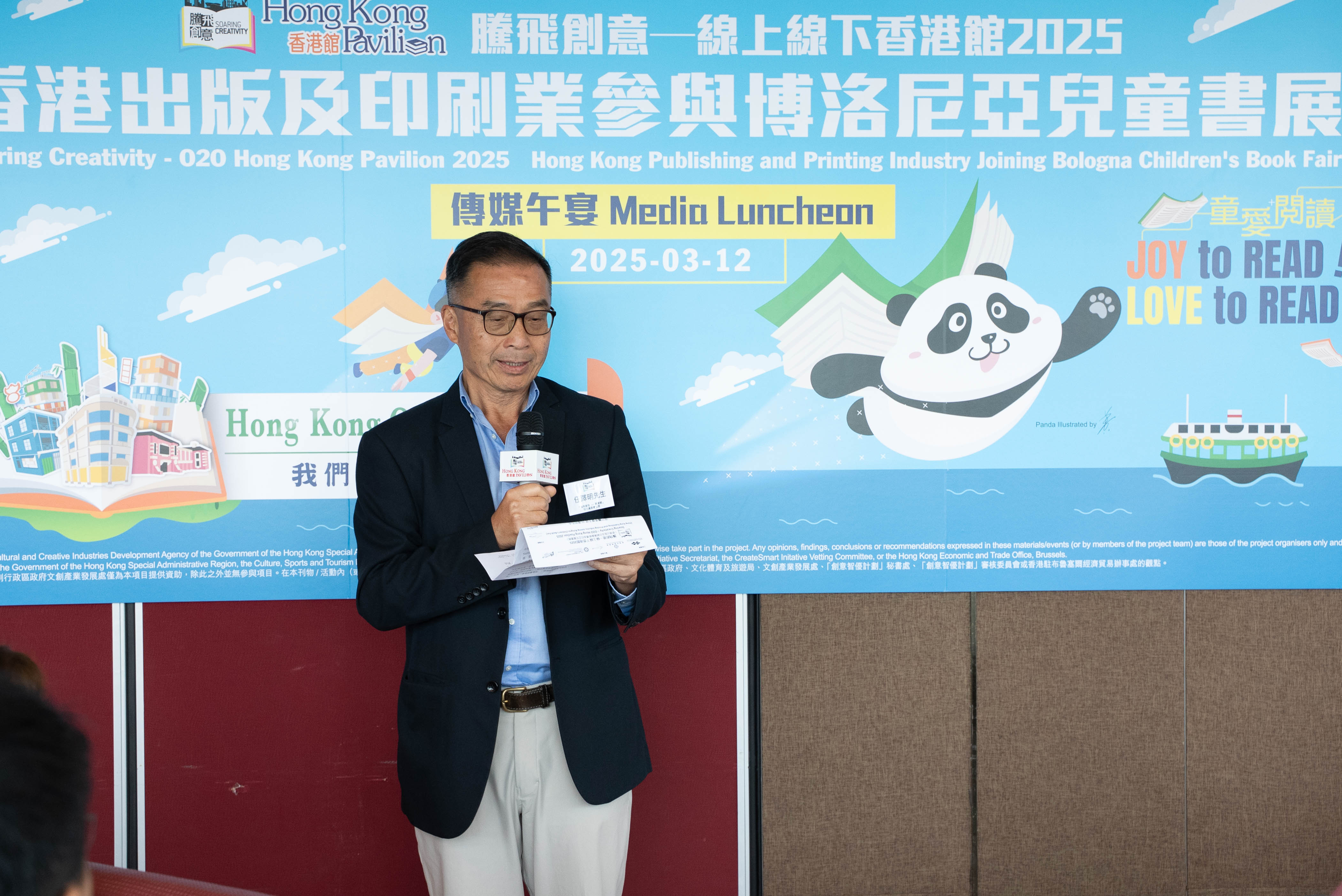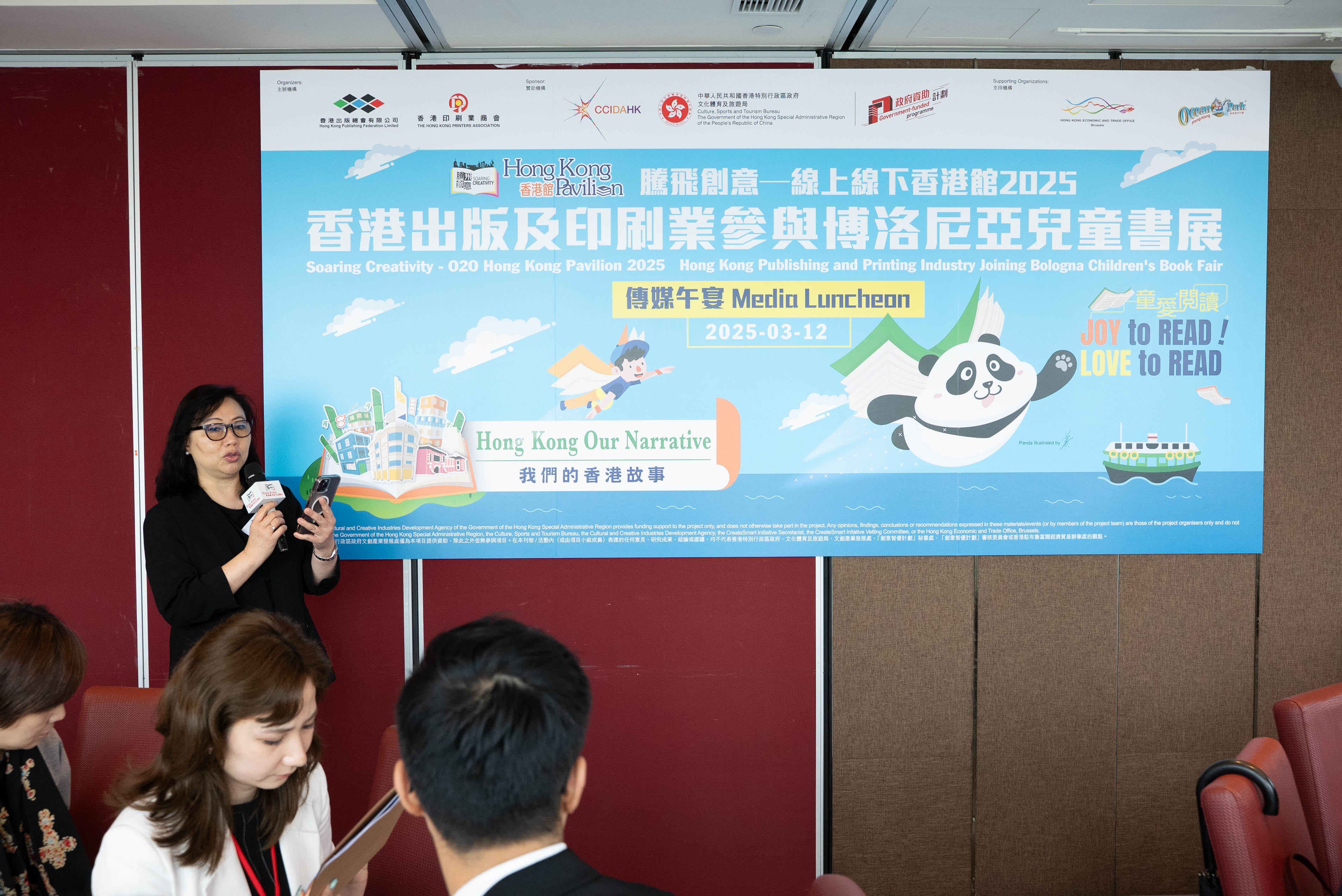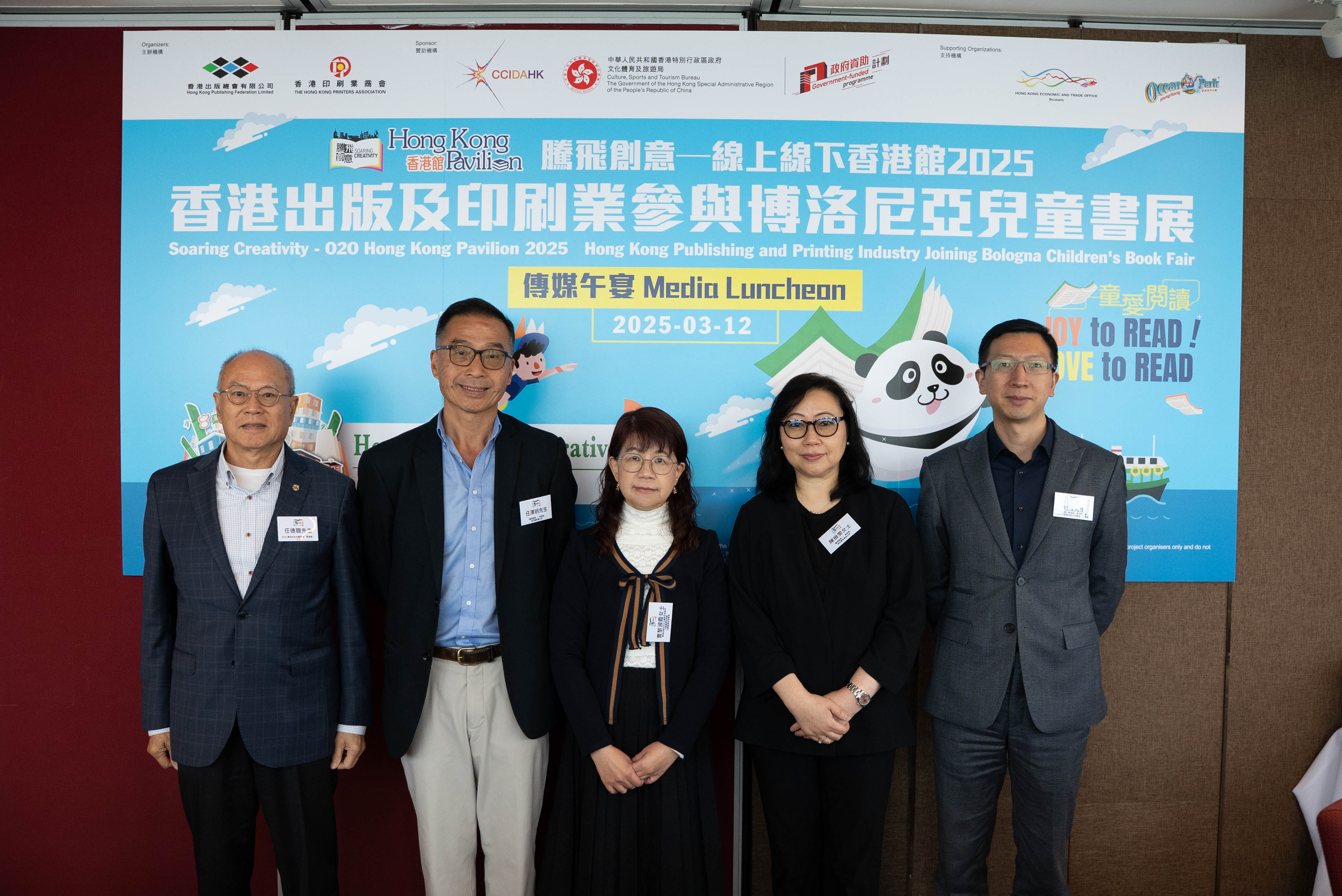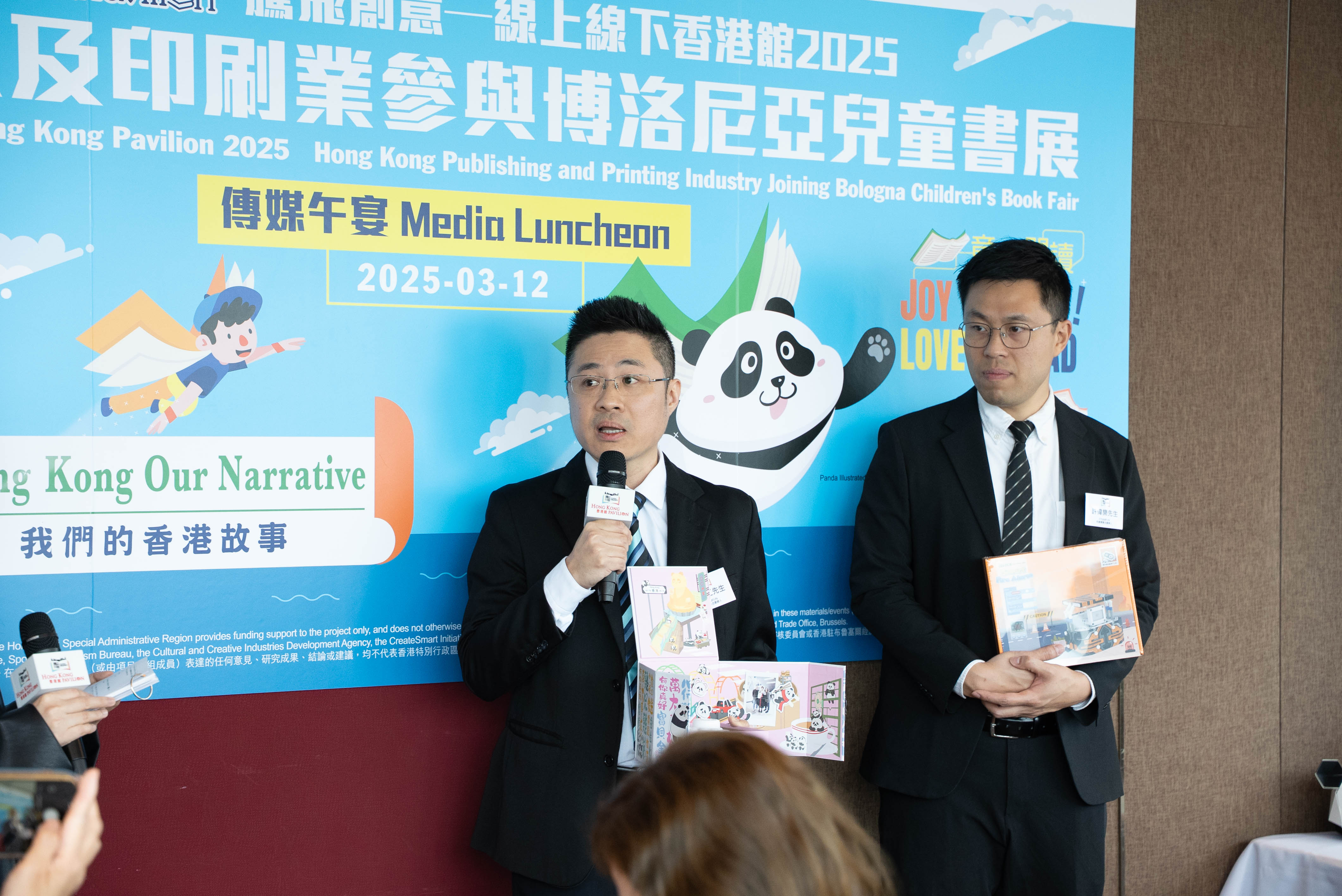 - 【傳媒午宴】首次以大熊貓為主題的「創意角」,加強說好香港故事! 由香港出版總會與香港印刷業商會合辦,並獲文創產業發展處資助的「騰飛創意──線上線下香港館2025」,將於2025年3月31日至4月3日亮相在意大利舉行的「博洛尼亞兒童書展」,設立「香港館」。是次「香港館」更獲香港特別行政區政府駐布魯塞爾經濟貿易辦事處與香港海洋公園的支持,並將繼續以實體加虛擬的形式,展示香港出版及印刷業的創意作品,展現香港的文旅魅力,並延續「我們的香港故事」主題及「童愛悅讀」副題。 主辦機構於今天(12日)舉行傳媒午宴,邀得文創產業助理專員曹黎淑霞女士主禮。「騰飛創意—香港館」項目籌委會主席任澤明先生及副主席陳儉雯女士、2025年博洛尼亞兒童書展「香港館」主席任德聰先生,還有2025年博洛尼亞兒童書展「香港館」的文化活動講者,包括新雅文化事業有限公司總經理兼總編輯周晟先生、STEAMFUN—科創樂聯合創辦人賴明仁先生及許偉樂先生,以及創意創業會第一副會長梁永恩先生均有出席。傳媒午宴上,多名嘉賓介紹及分享本屆博洛尼亞兒童書展「香港館」的主題、展區特色、四天展覽的活動安排及各人的期望等。 項目籌委會主席任澤明在席上提到,香港的出版及印刷業界多年來參加「香港館」已建立良好口碑。他稱本屆「香港館」獲得業界的大力支持,將展示約900件來自香港出版商及印刷商的優秀作品,充分展現香港出版印刷業的卓越實力。 項目籌委會副主席陳儉雯女士也為大家介紹了展覽亮點,包括「創意角」的特色展品。本屆博洛尼亞兒童書展「香港館」響應近期香港全城大熊貓熱潮,在「香港館」的「創意角」展示以大熊貓為特色的創意紙藝、文創產品及精選書籍。希望藉著本次聚焦大熊貓主題,向世界各地的買家及潛在合作夥伴,展示香港印刷及出版業界的創意,可以因應不同主題創作不同的出版物及印藝產品,迎合市場的需要。 此外,「香港館」將為香港繪本插畫師提供展示平台,讓他們的新作在匯聚全球童書出版社、作家及插畫師的國際書展上作首發。將率領香港繪本插畫師參與2025年博洛尼亞兒童書展「香港館」的創意創業會第一副會長梁永恩先生,亦在傳媒午宴上介紹第二屆「《飛躍繪本》—香港繪本插畫師國際書展推廣計劃」(《飛躍繪本》)及「香港繪本出版支援計劃」,其中包括將在「香港館」舉行歐洲首發儀式的八本《飛躍繪本》無字繪本。 「騰飛創意──線上線下香港館2025」將不僅展現香港文創產業的蓬勃發展,同時亦會在世界舞台上說好香港故事。