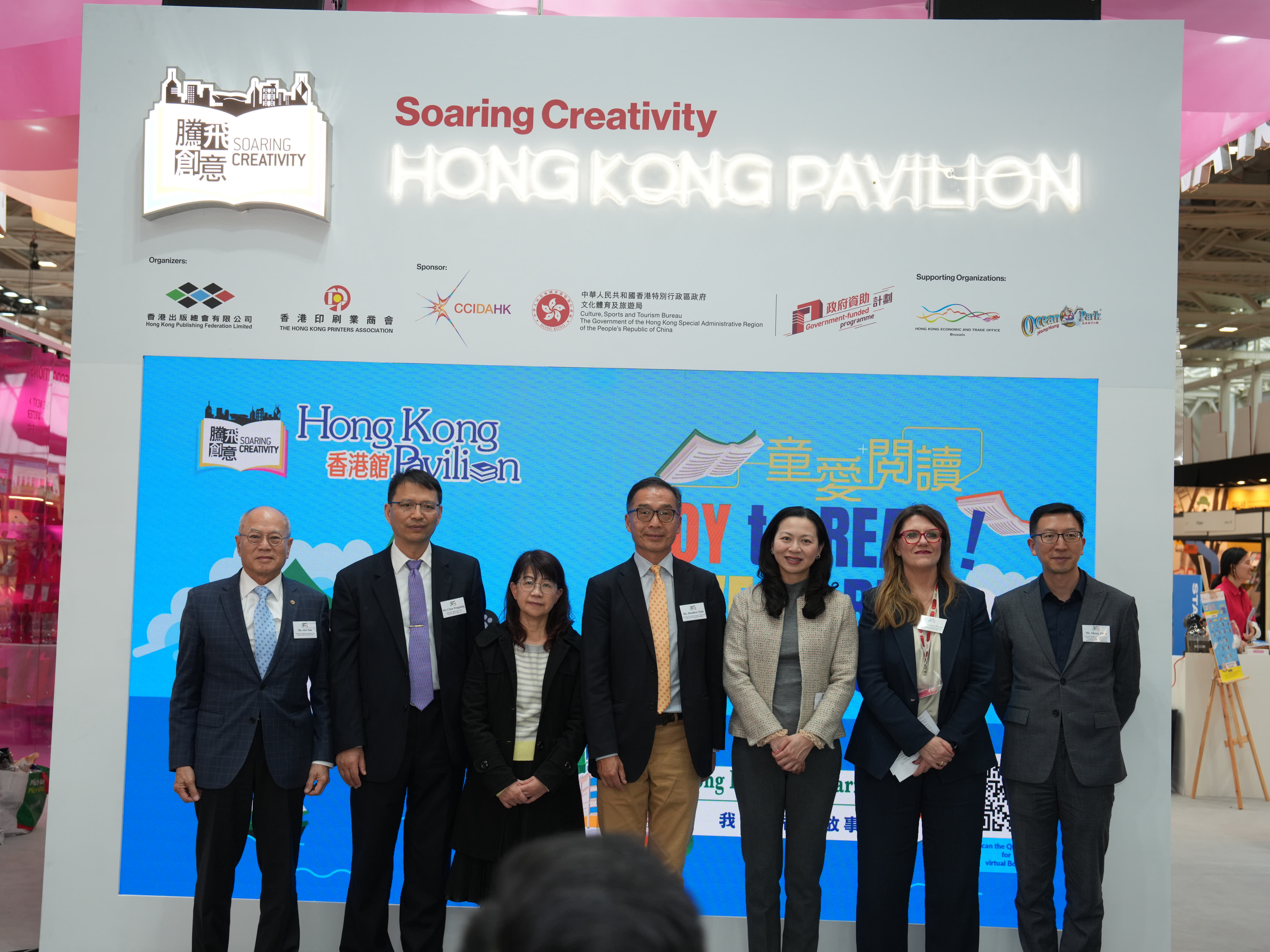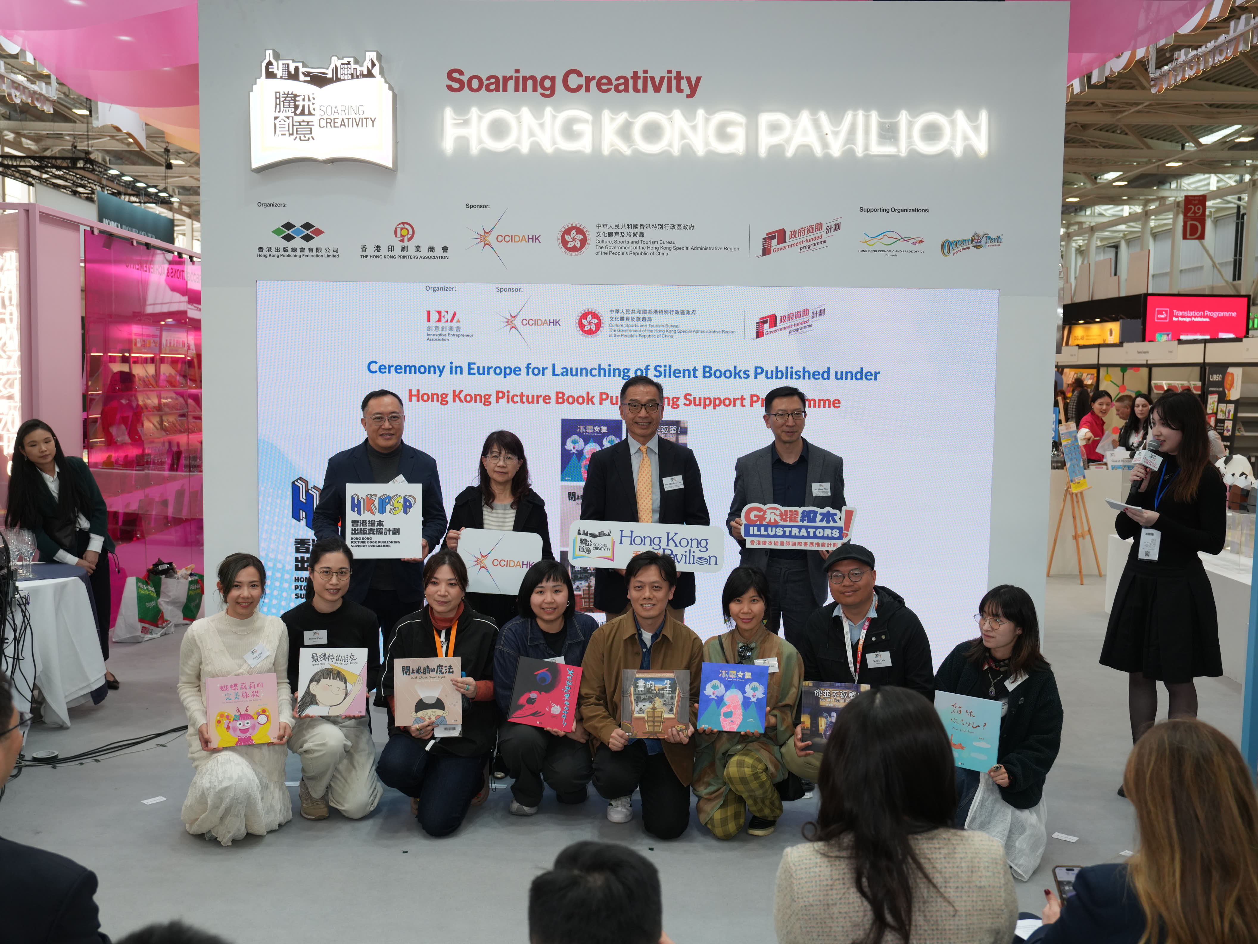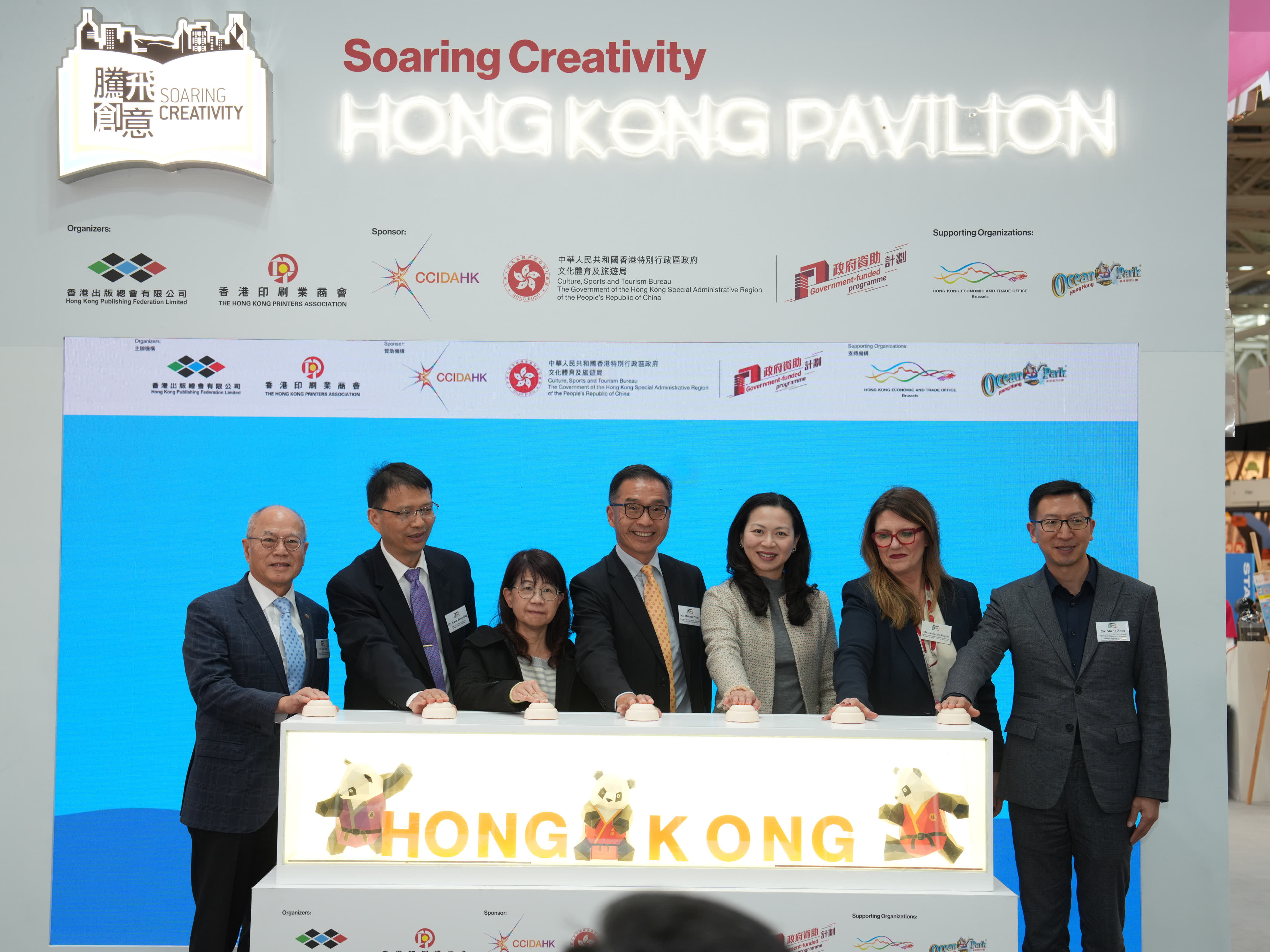 - 2025年3月31日,設於今年博洛尼亞兒童書展的「香港館」隆重揭幕。揭幕酒會上嘉賓雲集,氣氛熱烈。文創產業助理專員曹黎淑霞女士、香港駐布魯塞爾經濟貿易辦事處副代表李詠璇女士、博洛尼亞兒童書展中國團團長陳鵬鳴先生蒞臨主禮,與博洛尼亞Communication and Institutional Relations總監Francesca Puglisi女士,與「騰飛創意—香港館2025」主辦機構一衆代表,包括「騰飛創意—香港館 2025」項目籌委會主席任澤明先生、「2025博洛尼亞兒童書展—香港館」主席任德聰先生、「騰飛創意—香港館2025」項目籌委會委員周晟先生,一同為「香港館」揭開序幕。他們共同點亮了一座象徵香港文化與創意的燈箱,正式拉開了2025年博洛尼亞兒童書展「香港館」的序幕。 「騰飛創意—香港館2025」項目籌委會主席任澤明先生在揭幕酒會致辭時特別感謝文創產業處對「騰飛創意—香港館」項目的長期支持,並感謝香港駐布魯塞爾經濟貿易辦事處在多方面的支援,並向「香港館」各參展商與支持機構,包括首度合作的香港海洋公園對項目的支持,表達由衷謝意。 揭幕酒會還舉行了「香港繪本出版支援計劃」 《飛躍繪本系列》歐洲首發儀式,有支援計劃的主辦機構創意創業會的第一副會長梁永恩先生與相關香港繪本插畫師參與了儀式。有關支援計劃由文創產業處資助。此外,揭幕酒會上亦舉行了書籍捐贈儀式,2025年博洛尼亞兒童書展「香港館」將精選一批優秀的參展書籍,在書展後捐贈給錫耶納外國人大學,該院校的代表李若瑩教授在儀式上接受了捐贈。