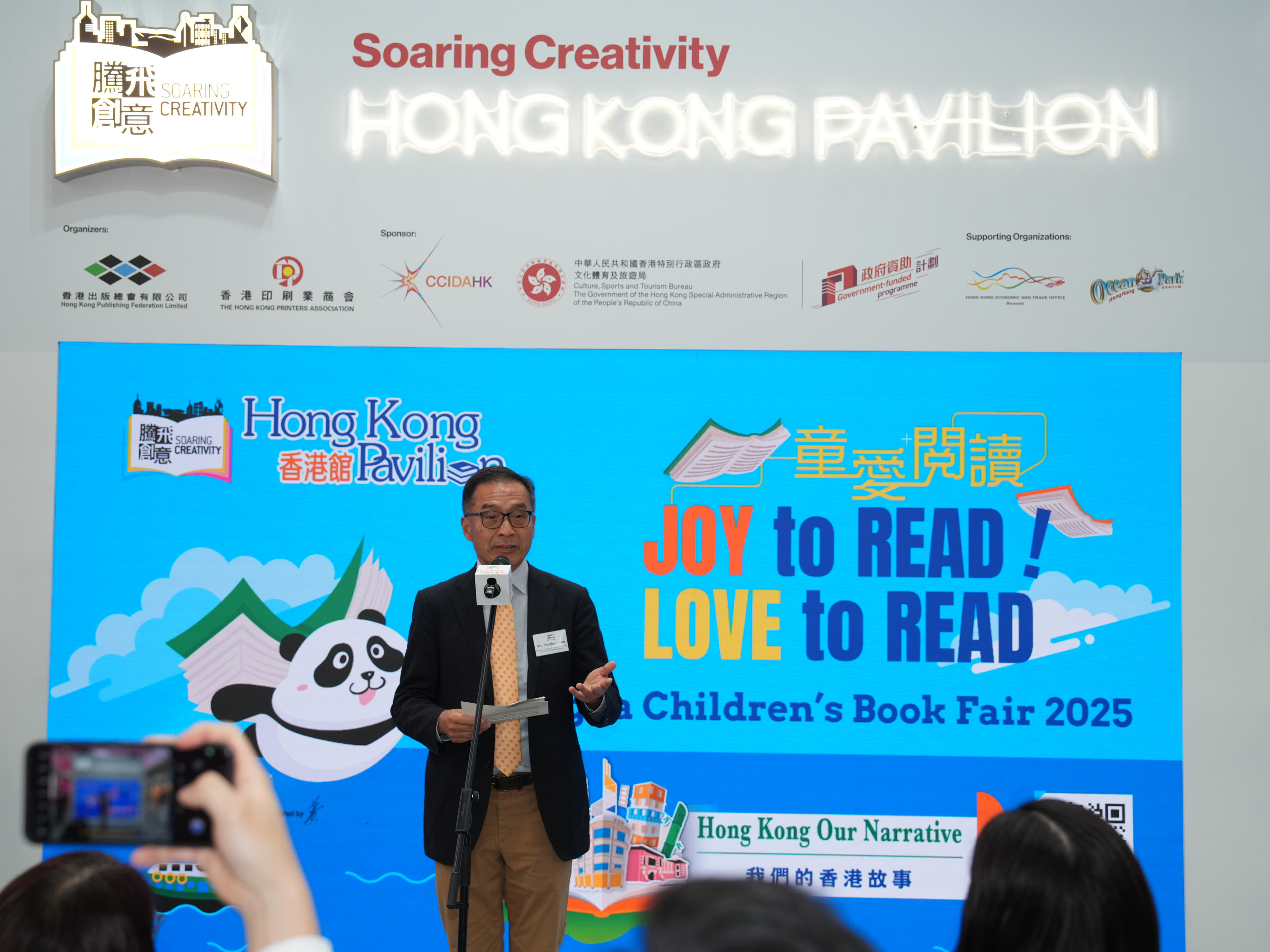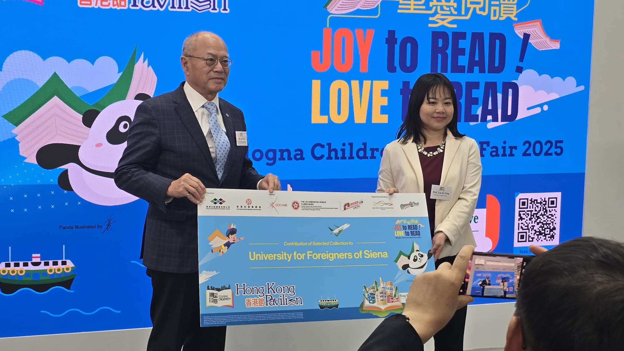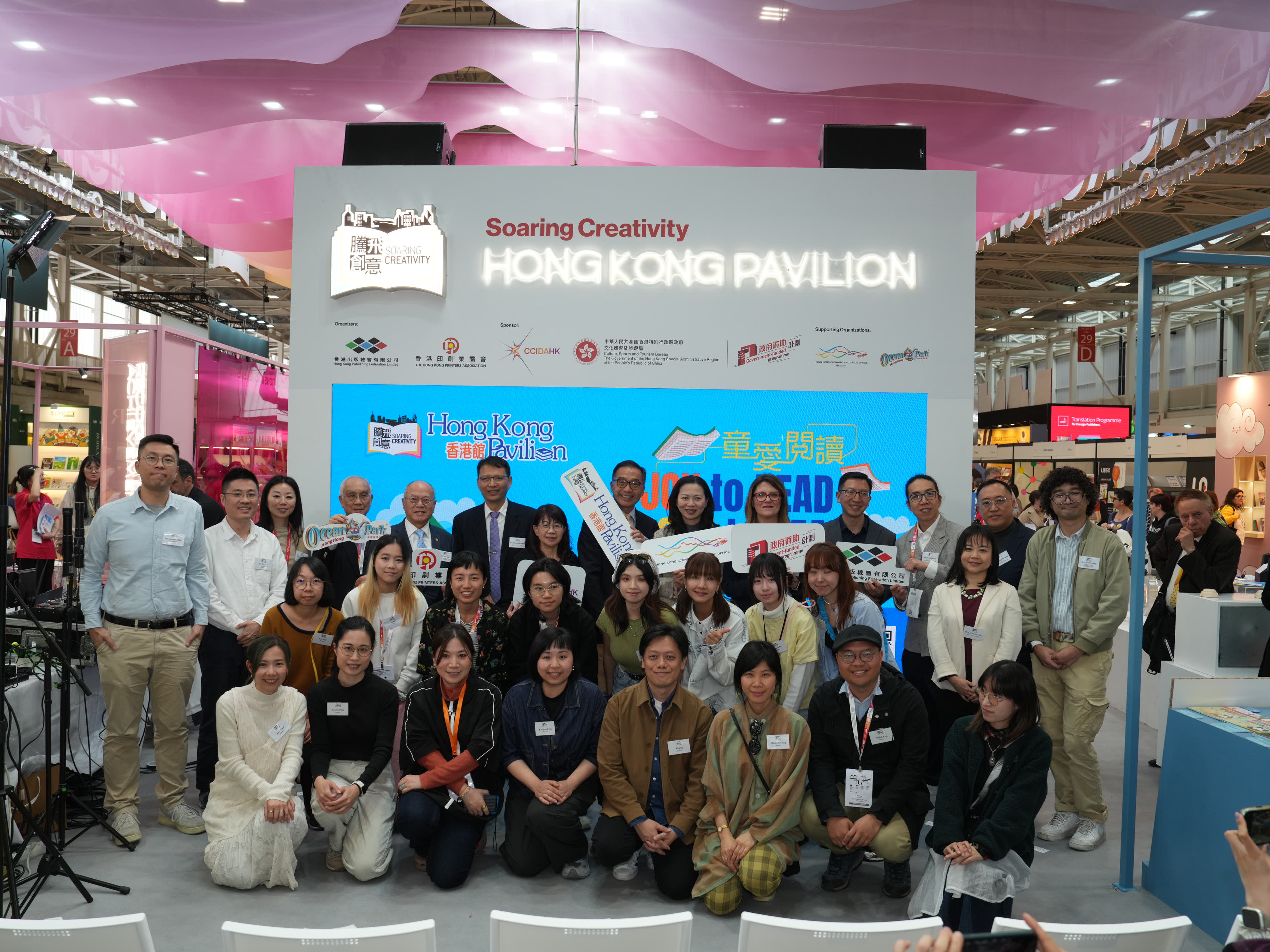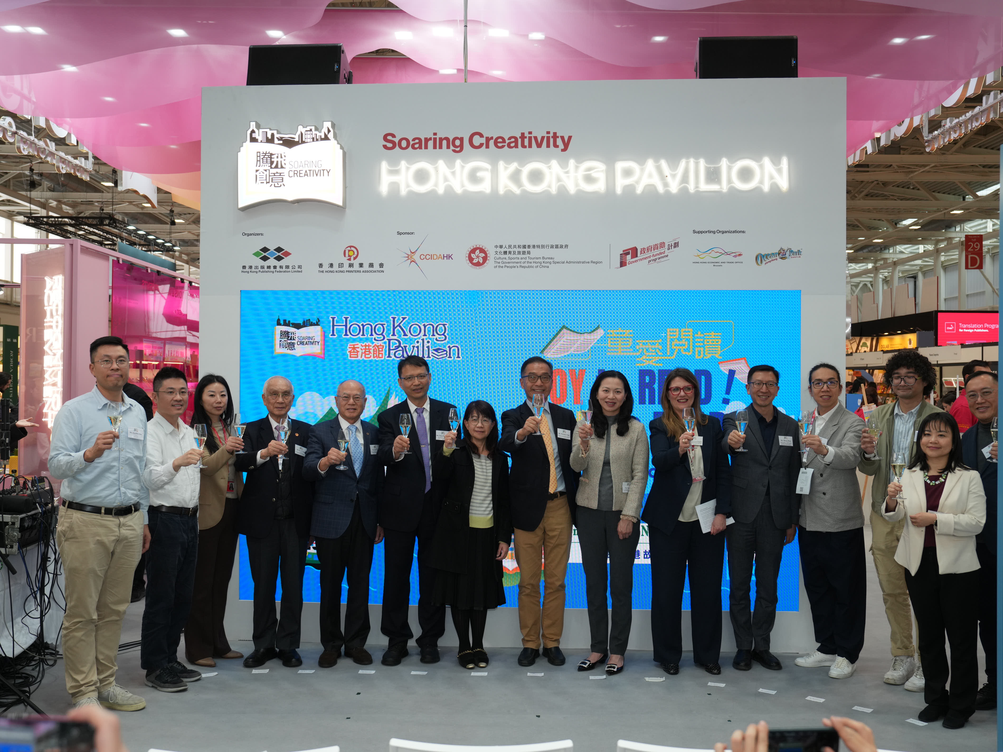 - 2025年3月31日,設於今年博洛尼亞兒童書展的「香港館」隆重揭幕。揭幕酒會上嘉賓雲集,氣氛熱烈。文創產業助理專員曹黎淑霞女士、香港駐布魯塞爾經濟貿易辦事處副代表李詠璇女士、博洛尼亞兒童書展中國團團長陳鵬鳴先生蒞臨主禮,與博洛尼亞Communication and Institutional Relations總監Francesca Puglisi女士,與「騰飛創意—香港館2025」主辦機構一衆代表,包括「騰飛創意—香港館 2025」項目籌委會主席任澤明先生、「2025博洛尼亞兒童書展—香港館」主席任德聰先生、「騰飛創意—香港館2025」項目籌委會委員周晟先生,一同為「香港館」揭開序幕。他們共同點亮了一座象徵香港文化與創意的燈箱,正式拉開了2025年博洛尼亞兒童書展「香港館」的序幕。 「騰飛創意—香港館2025」項目籌委會主席任澤明先生在揭幕酒會致辭時特別感謝文創產業處對「騰飛創意—香港館」項目的長期支持,並感謝香港駐布魯塞爾經濟貿易辦事處在多方面的支援,並向「香港館」各參展商與支持機構,包括首度合作的香港海洋公園對項目的支持,表達由衷謝意。 揭幕酒會還舉行了「香港繪本出版支援計劃」 《飛躍繪本系列》歐洲首發儀式,有支援計劃的主辦機構創意創業會的第一副會長梁永恩先生與相關香港繪本插畫師參與了儀式。有關支援計劃由文創產業處資助。此外,揭幕酒會上亦舉行了書籍捐贈儀式,2025年博洛尼亞兒童書展「香港館」將精選一批優秀的參展書籍,在書展後捐贈給錫耶納外國人大學,該院校的代表李若瑩教授在儀式上接受了捐贈。