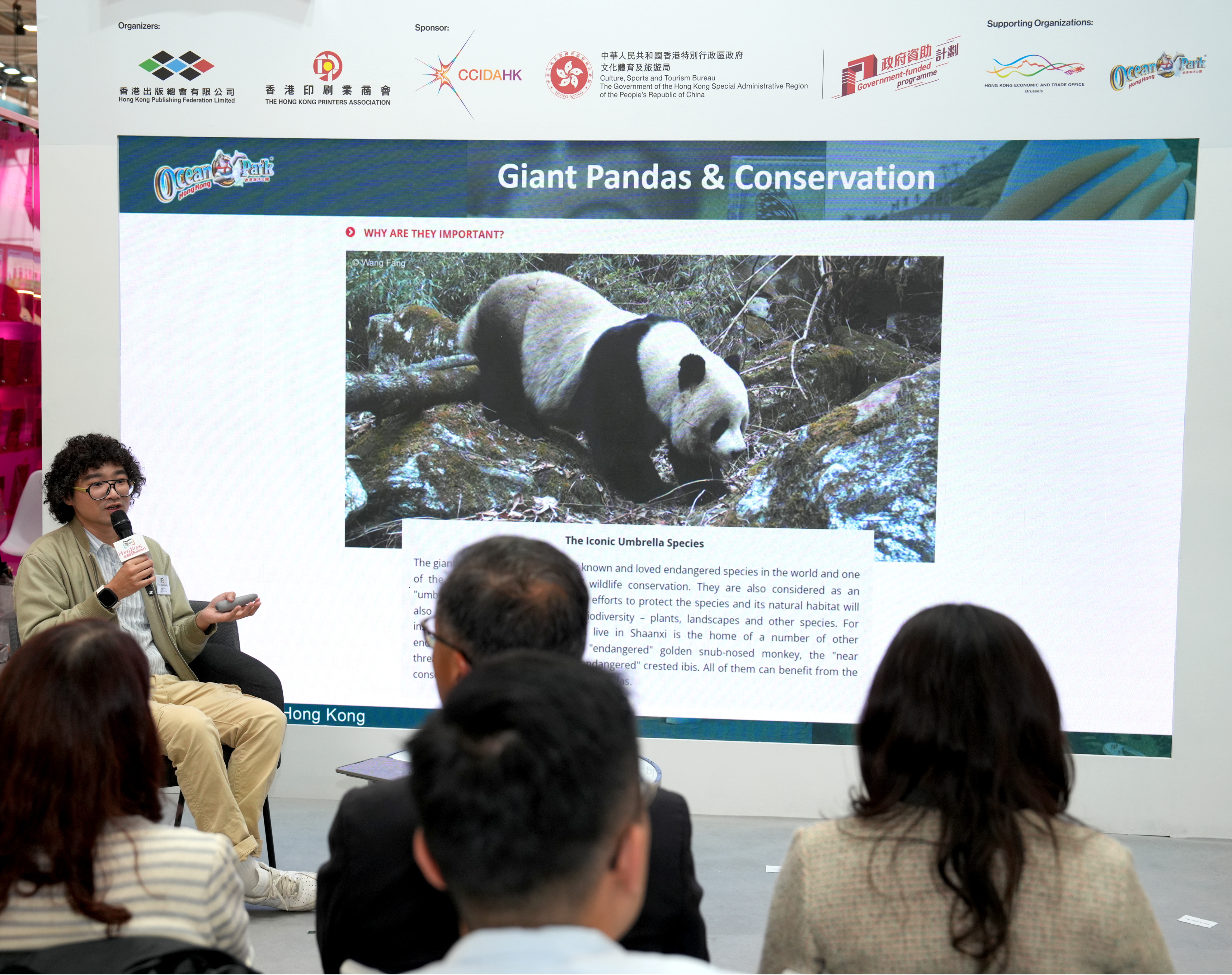 - 由香港出版總會及香港印刷業商會合辦、文創產業發展處資助的2025年博洛尼亞兒童書展「香港館」,首場文化活動於3月31日(意大利時間)舉行,由香港海洋公園的助理館長梁家綸先生打響頭炮,他以「我們的大熊貓 - 香港海洋公園的保育故事」為講題,為現場觀眾帶來了一場深入且充滿溫情的分享會,吸引了眾多參觀者駐足聆聽,現場座無虛席。 梁家綸(Matt)是香港海洋公園的助理館長,專責大熊貓逾14年。他並憑藉照顧不同動物,對動物訓練原理有著深刻的了解,擁有大熊貓護理方面的專業知識。梁家綸在海洋公園的工作包括照顧大熊貓的健康及福祉,同時亦透過日常工作提高公眾的保育意識。 梁家綸先生在分享會中提到,大熊貓在香港深受市民喜愛,是極具標誌性的動物大使。牠們代表了香港海洋公園多年來在動物護理、保育和教育方面的使命與承諾。訪客遊覽海洋公園時不僅可以欣賞到大熊貓的可愛面貌,更可了解牠們在香港的獨特故事,以及公園在保護大熊貓方面的工作。透過世界級的動物護理,海洋公園不僅為遊客帶來歡樂,更推動了動物福祉、保育及科研。透過香港大熊貓的故事,期望提高大眾保護大自然的意識,並將這份使命傳承給下一代。 梁家綸先生的專業分享不僅展現了香港海洋公園的保育使命,也為「騰飛創意—香港館2025」的首日活動增添了深刻的文化內涵與教育意義。