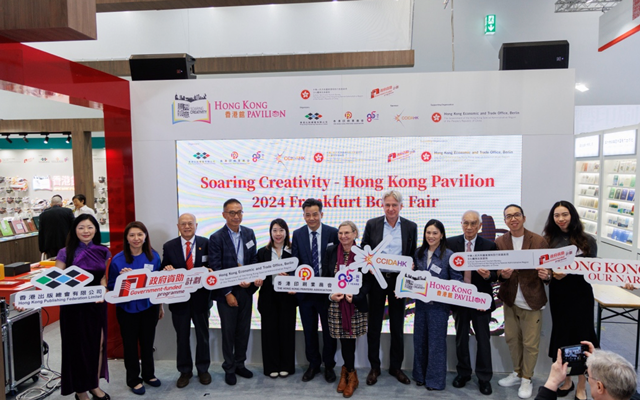 由香港出版總會及香港印刷業商會合辦、文創產業發展處資助的「騰飛創意—香港館」(下稱「騰飛創意」)項目於今年10月16至20日第十一度參與德國「法蘭克福書展」設立「香港館」,並繼續邀得香港駐柏林經濟貿易辦事處擔任支持機構。「騰飛創意」項目主辦機構於10月16日在「法蘭克福書展」會場為「香港館」舉行揭幕酒會,邀得新聞出版總署進出口管理局副局長 趙海雲先生、香港駐柏林經濟貿易辦事處處長 司徒加敏女士及法蘭克福書展副總裁 柯樂迪女士蒞臨主禮,與主辦機構代表包括「騰飛創意—香港館 2024」項目籌委會主席 任澤明先生及「2024法蘭克福書展—香港館」主席 任家寶女士共同主持揭幕儀式。